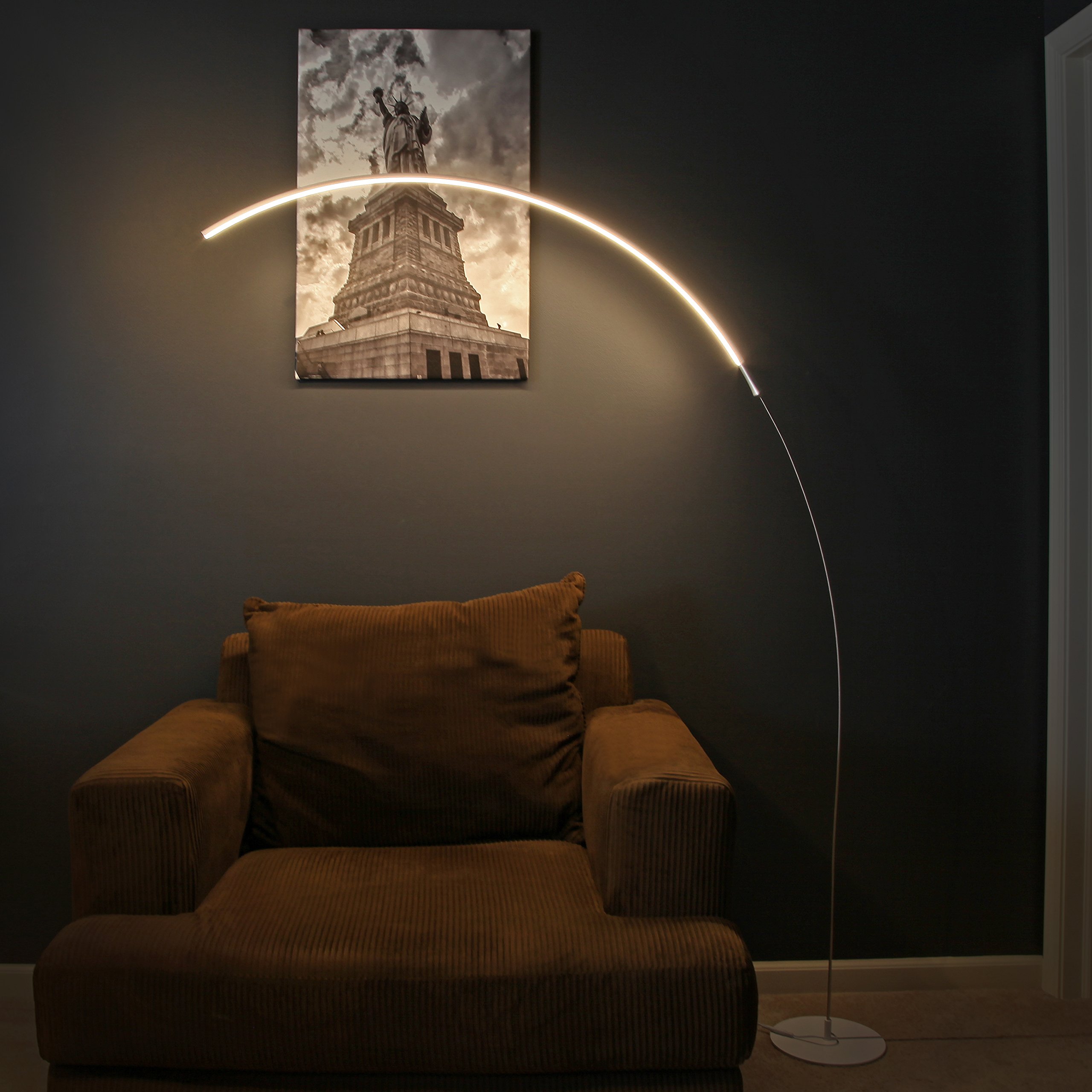 Minimalist, Energy Saving LED Arc Floor Lamp, Curved, Contemporary Lighting Design for Intimate Dwellings and Warm & Bright White Light Settings.