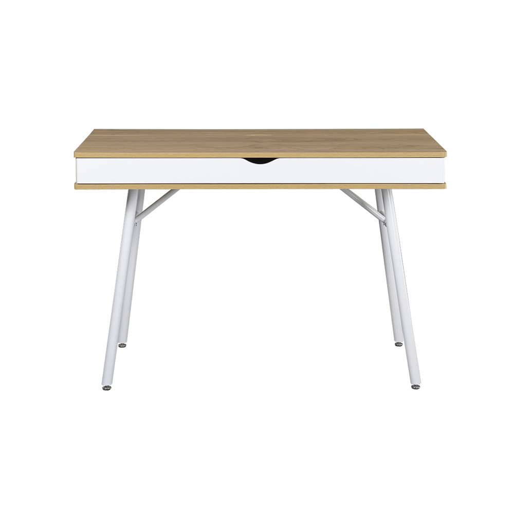 This is a designer desk at a relatively affordable price. The work surface consists of a robust and shatter-resistant tempered glass top with white lacquered MDF shelf underneath. The legs are made of sturdy bamboo.