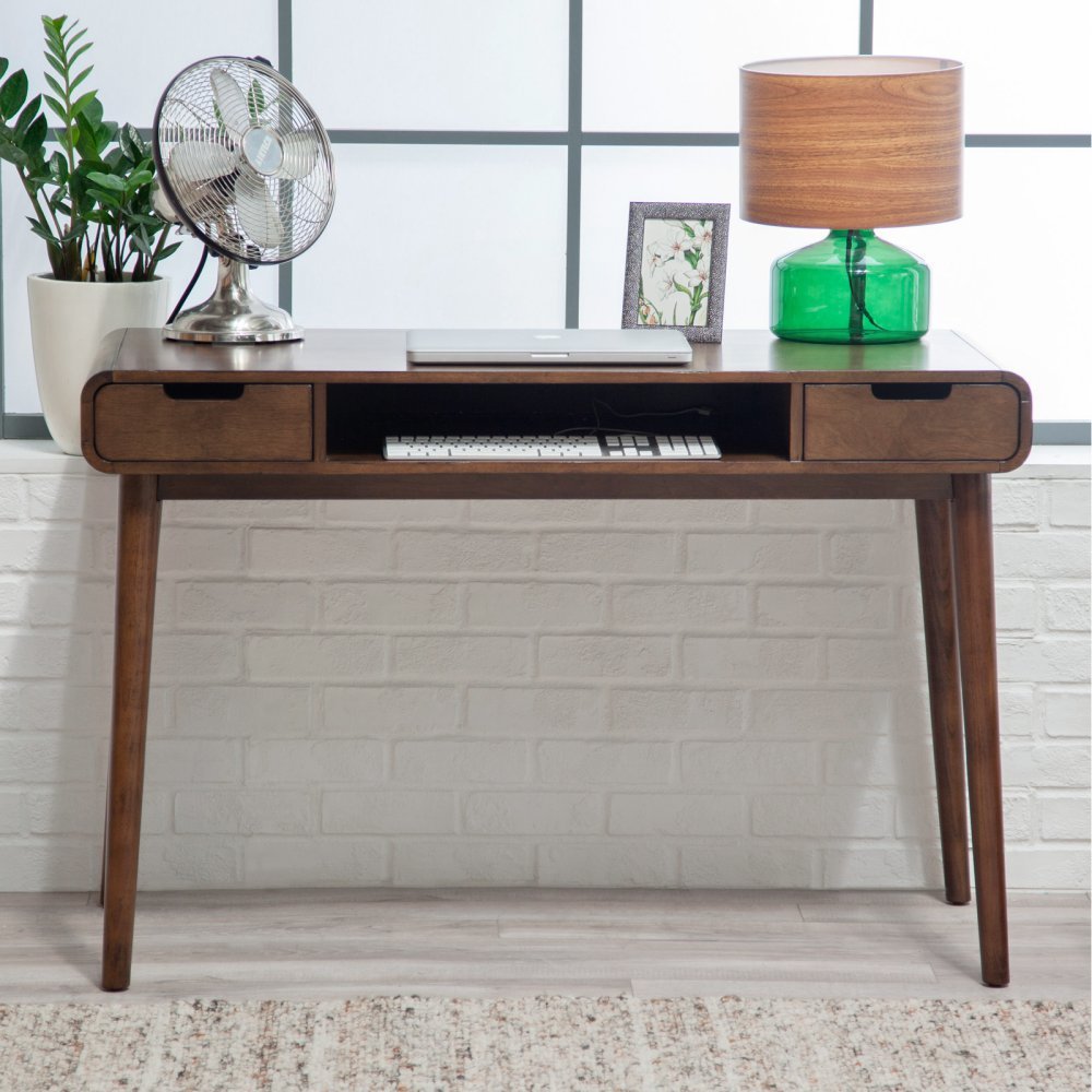 Living Carter, Mid Century Modern Writing Desk, with Walnut Finish and Solid Poplar Wood Legs with Birch Veneer.