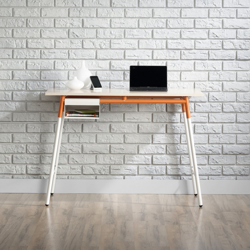 Square1 Modern Laptop Desk, Wood and Metal Frame, White with Maple and Orange Accents.