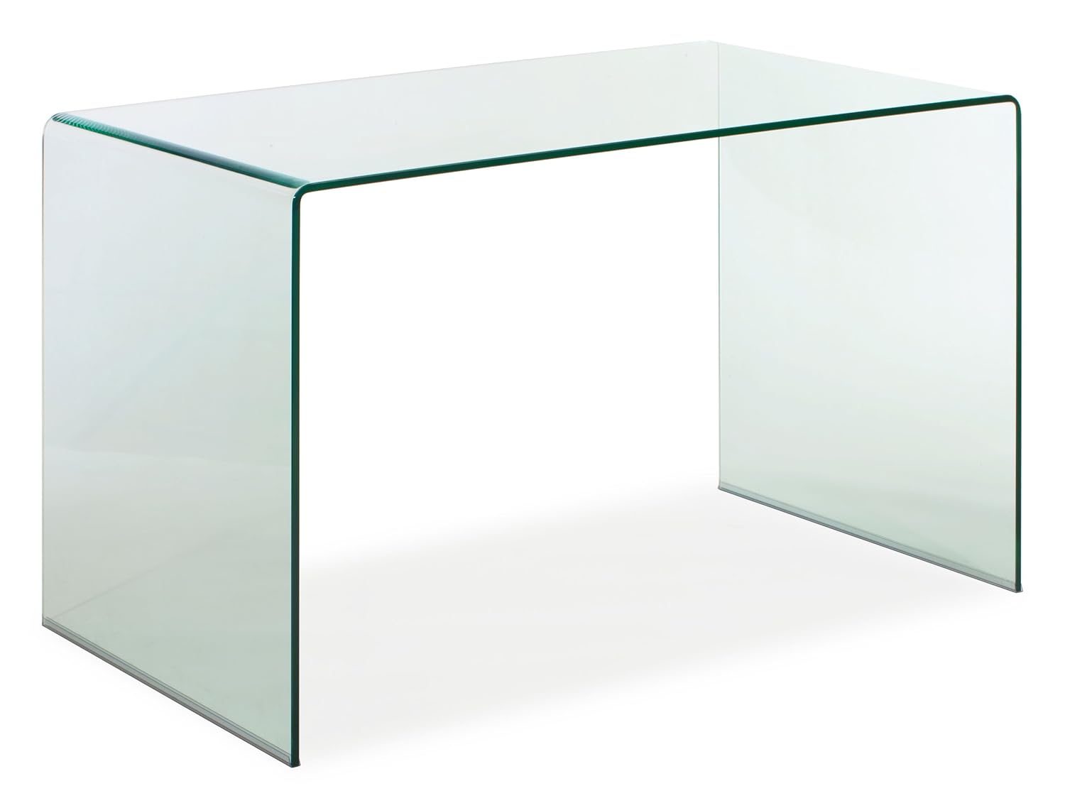 Modern, Geometric Glass Computer Desk with Open Storage and Clear Tempered Glass Surface.